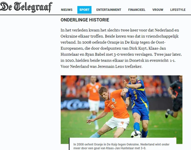 NU.nl радіє варіанту з нашими ще до жеребкування. Портал вважає, що друге місце Нідерландів після Німеччини навряд чи можна називати недоліком, адже з першого кошика команді Кумана випала Україна, а не топ-збірні. А ось Telegraaf забув, як "синьо-жовті" успішно грали на Чемпіонаті світу 2006, зате пригадує 2 поспіль розчарування від попередніх Євро. Автор видання Йорік Хокке вважає нашим найвідомішим найкращим гравцем відбору Андрія Ярмоленка, якому "не вдалося повторити фурор часів Динамо в Борусії Д". Крім того, він пише, що Україна у відносно важкій групі з чинними чемпіонами Європи і сильними зірковими сербами досягла результату, якого мало хто чекав. На думку Хокке, після важкого старту ключовий імпульс команда отримала, розгромивши Сербію 5:0.