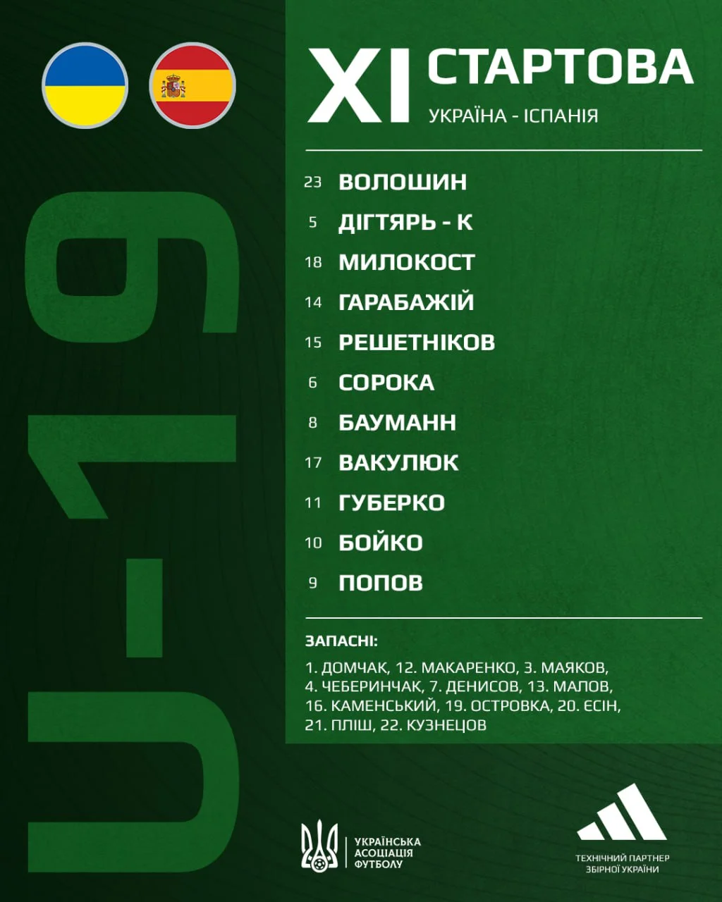 Стартовый состав Украины U-19: Волошин, Дигтярь (к), Милокост, Гарабажий, Решетников, Сорока, Бауманн, Вакулюк, Губенко, Бойко, Попов