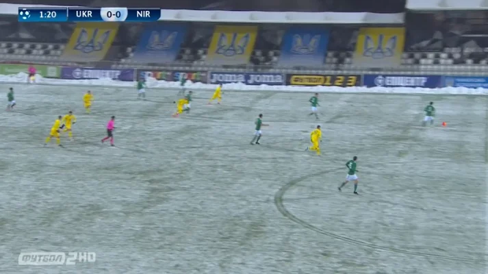 Ковалёвка встретила команды снегопадом, к которому команды привыкали добрых 20 минут. Особенно страдали ирландцы, которые откровенно мёрзли и скользили по полю, однако короткий пас украинцев в таких условиях тоже был ни к чему. В этот период не возникло ни одного момента, кроме падения Бенсела-МакНалти на правом краю штрафной – защитники взяли его в коробочку, но арбитр проигнорировал эпизод. Стоит также отметить, что гости очень качественно прессинговали, подолгу не выпуская нас за центр поля, но у обоих ворот стоял штиль.