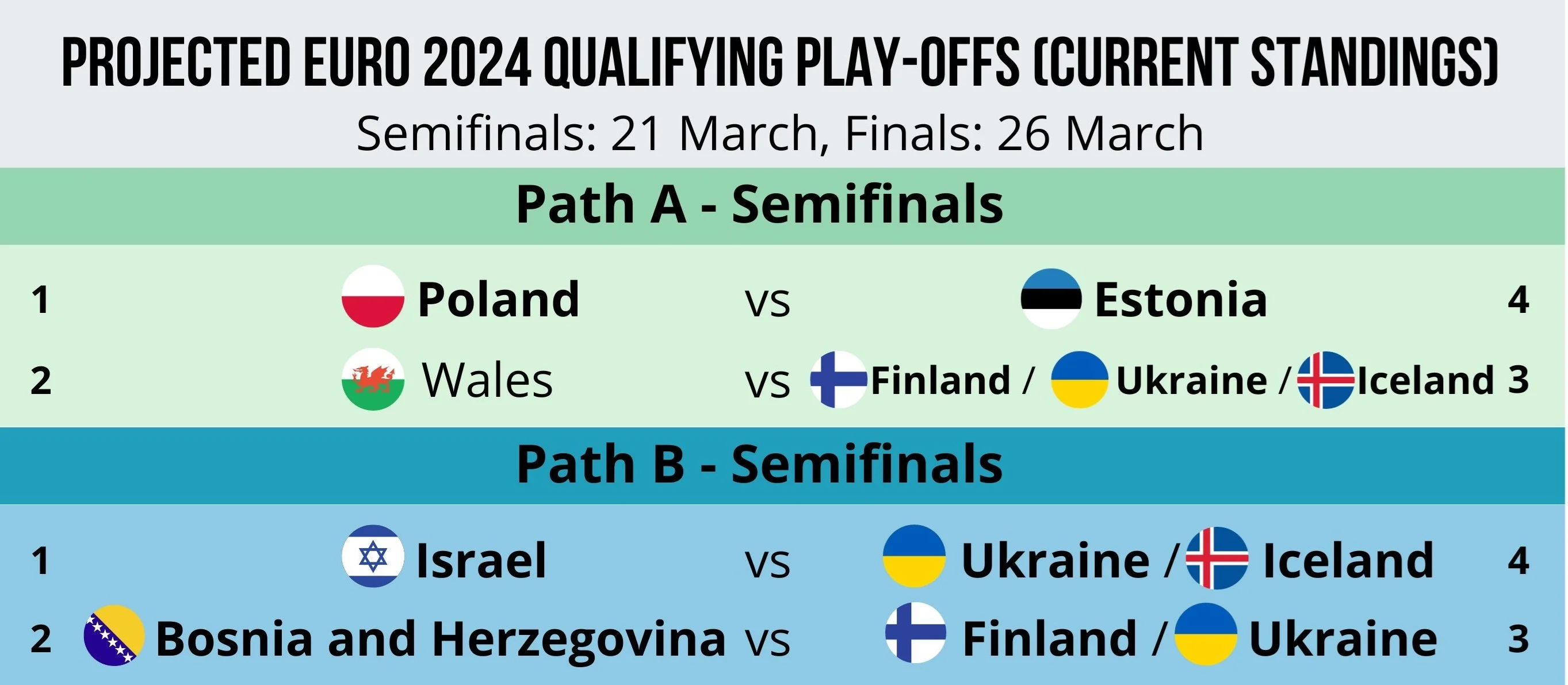 Если Украина попадет в путь Б (на это 66,6%), то в полуфинале встретится с Израилем или Боснией и Герцеговиной – это определит жребий. В финале придется играть с победителем другой пары, где будет Исландия или Финляндия.