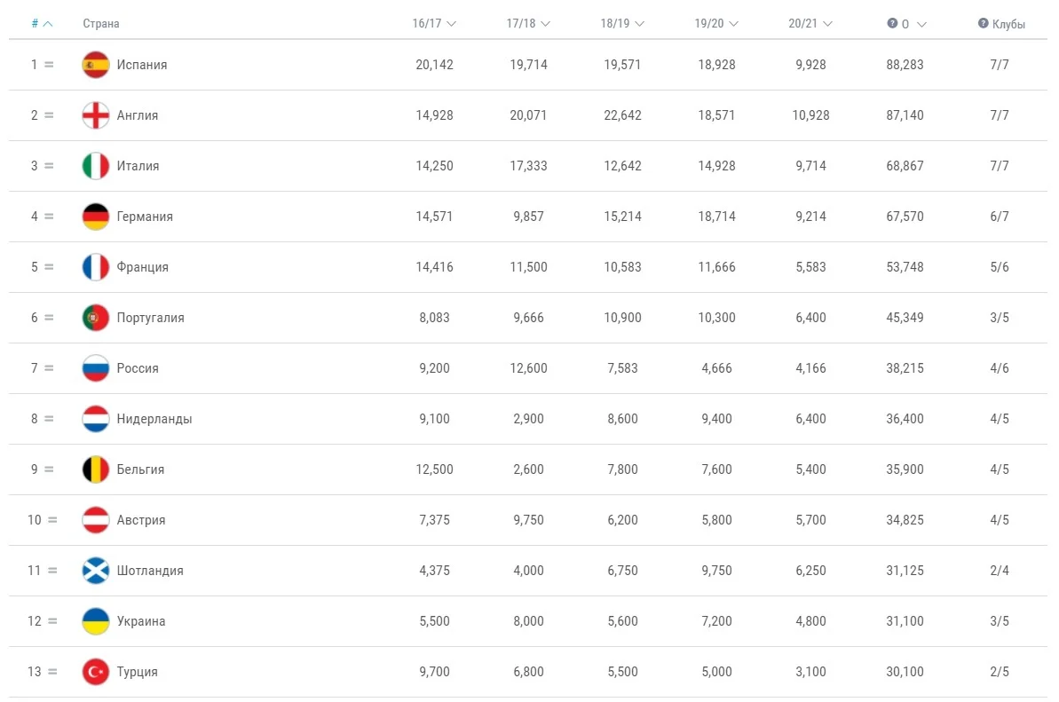 Интересно, что в топ-10 таблицы коэффициентов УЕФА никаких изменений не произошло – лидирует и в дальнейшем Испания.