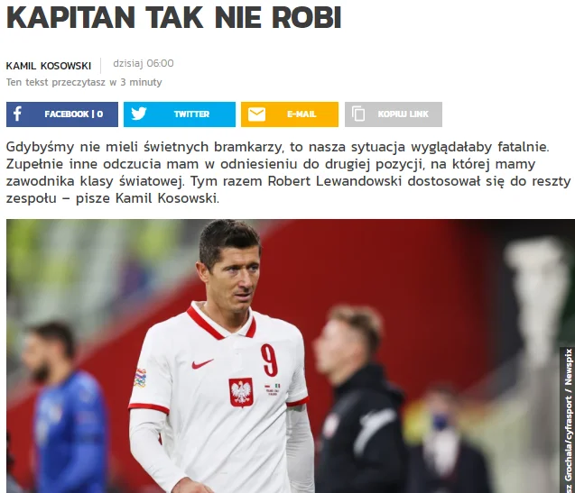 На этот раз Левандовски слился с остальной командой. Я не заметил, чтобы он придерживал мяч. Нельзя сказать, что Роберт играл хорошо, а другие – плохо. Были только защитники и вратарь, других не существовало. Его поведение после игры, эта показательная тишина, которой все восхищаются, мне совсем не понравилась. Роберт научился дипломатии, но похожие вещи нужно говорить в лицо. Получилось даже хуже, чем если бы он прямо сказал тренеру, что тот не разбирается в футболе. Капитан так не делает.