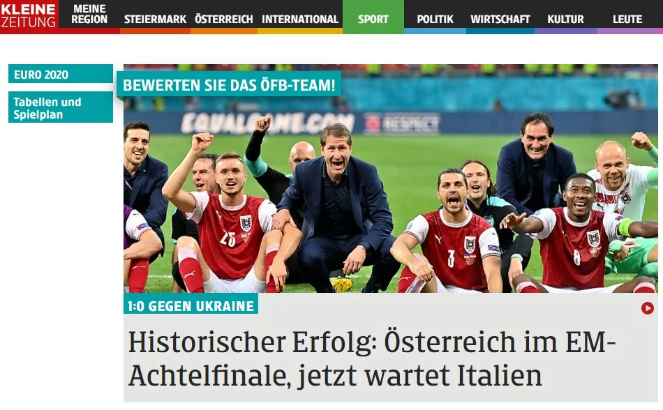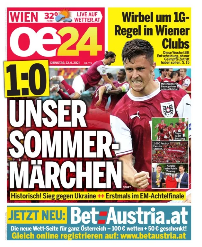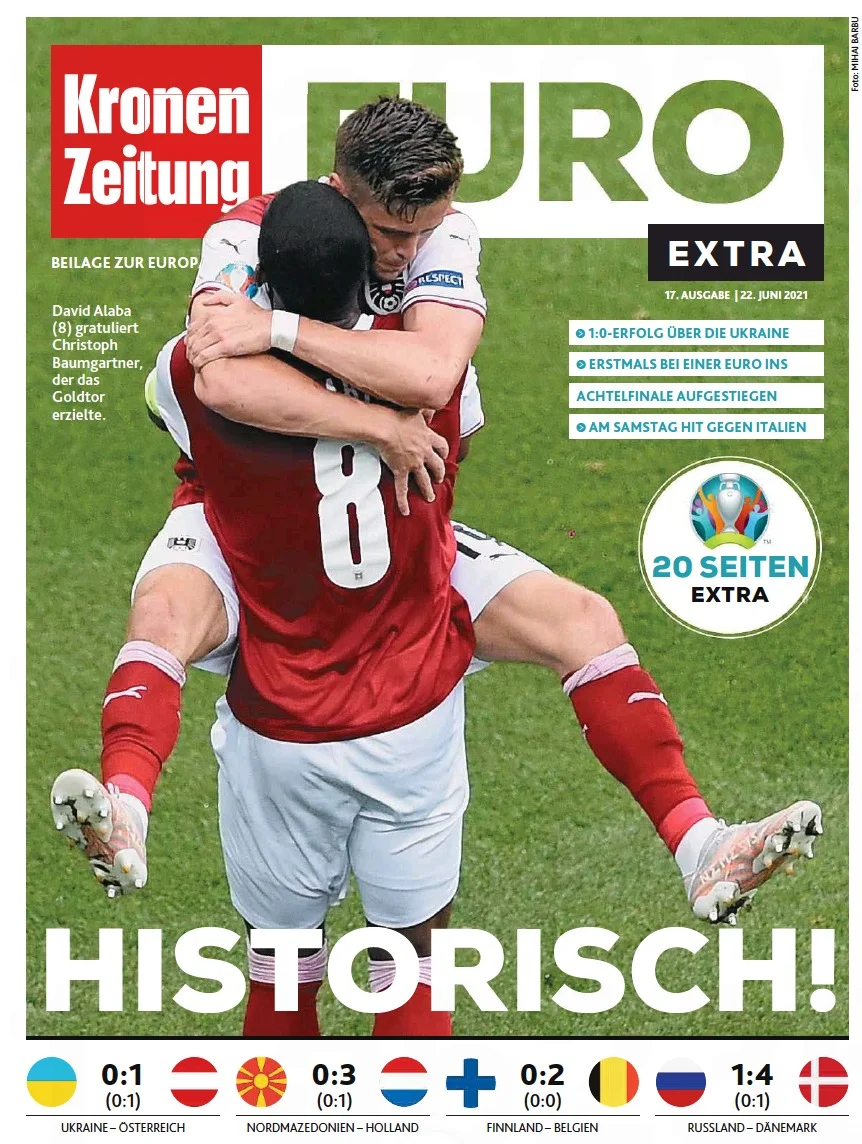 "Браво, хлопці! Обігравши Україну, наша збірна створила маленьке диво. Вся Австрія шаленіє через футбол. Мільйони фанів сиділи перед телевізором і одночасно крикнули "Австрія і тільки Австрія!" Ця перемога увійде в історію, вона залишиться незабутньою. Ми знову належимо до 16 найсильніших команд Європи!" – з піднесенням кричить популярна газета.