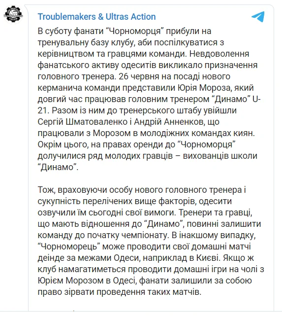 Недовольство фанатов вызвала персона главного тренера, который ранее работал с Динамо U-21. Главное требование болельщиков – тренеры и игроки, имеющие отношение к киевскому клубу, должны покинуть команду до начала чемпионата. В противном случае ультрас оставляют за собой право срывать домашние матчи Черноморца в Одессе. Фанаты намекнули, что в случае отклонения требований "моряки" будут принимать соперников за пределами Южной Пальмиры.