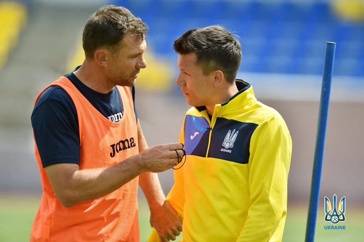 Андрій Шевченко доносить свої ідеї до Євгена Коноплянки / Фото УАФ