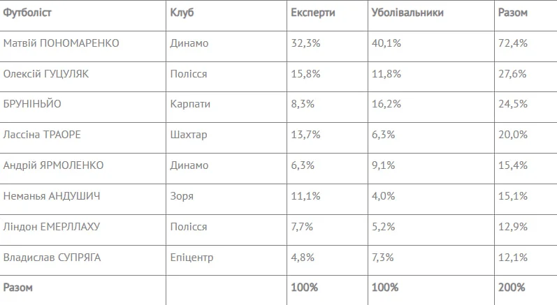Лучшим футболистом февраля-марта стал Матвей Пономаренко, который получил 32,3 процента голосов от экспертов и 40,1 от фанов. Отметим, что в последних пяти матчах нападающий киевского Динамо забил 7 голов. Второе место занял Алексей Гуцуляк из житомирского Полесья, а тройку замкнул Бруниньо из львовских Карпат.