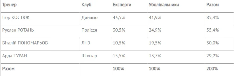 Среди битвы тренеров лучшим стал наставник Динамо Игорь Костюк – 43,5 процента голосов от экспертов и 41,9 от болельщиков. Второе место за Русланом Ротанем из Полесья, а на третьей позиции расположился Виталий Пономарев из черкасского ЛНЗ.