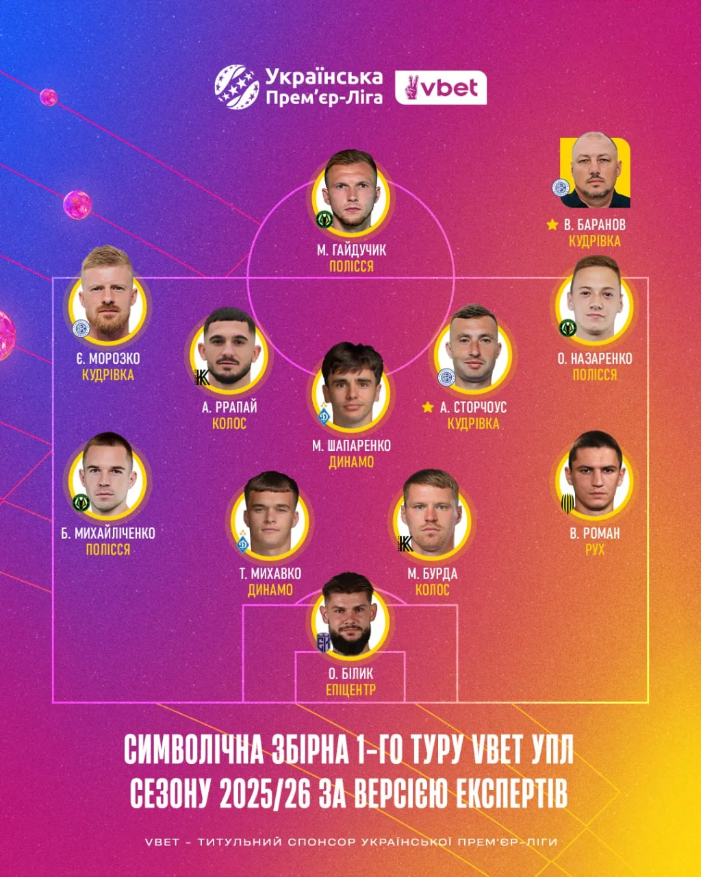 Стали известны лучшие игроки и тренер 1-го тура УПЛ сезона 2025/26.