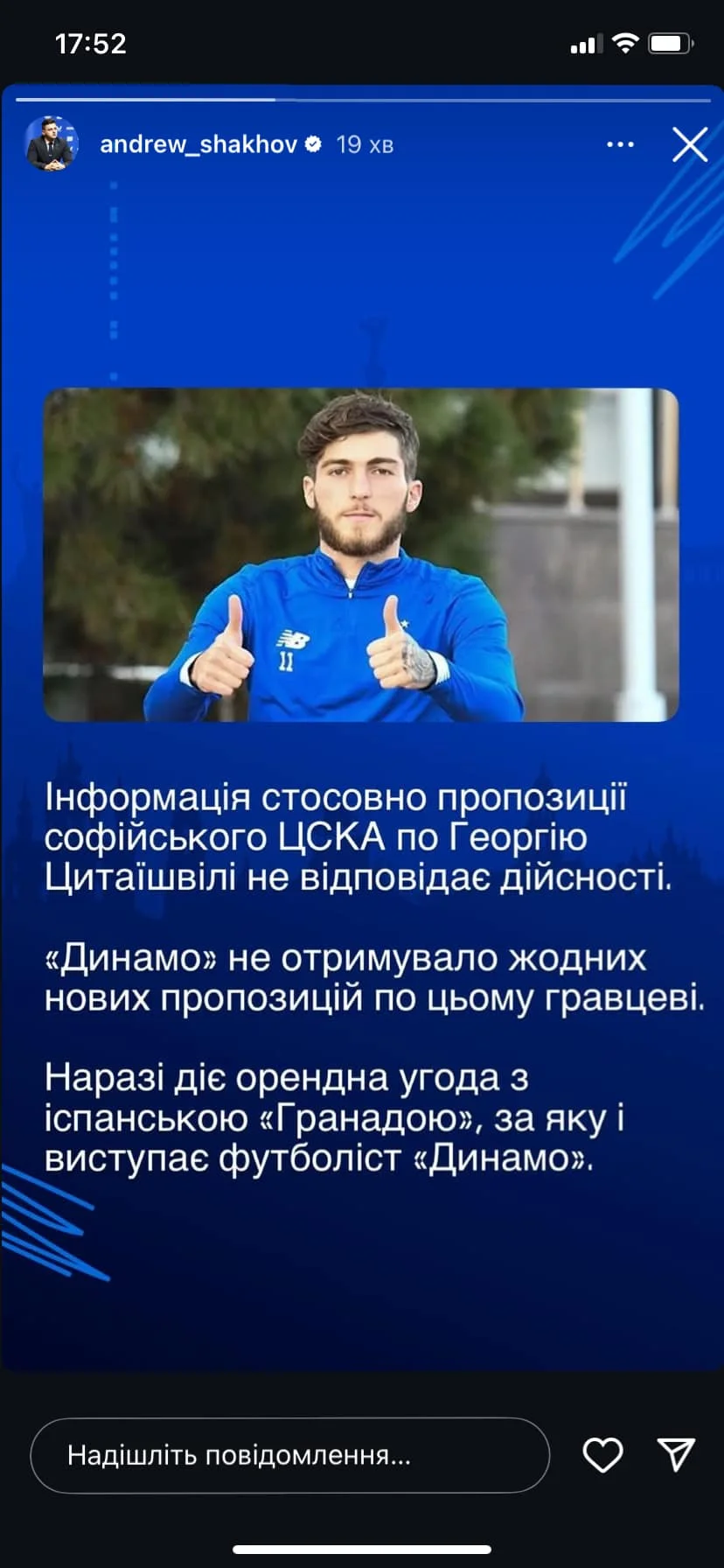 "Информация относительно предложения софийского ЦСКА по Георгию Цитаишвили не соответствует действительности. Динамо не получало никаких предложений по этому игроку. Сейчас действует арендное соглашение с испанской Гранадой, за которую и выступает Цитаишвили", – ответил на эти слухи пресс-атташе Динамо Андрей Шахов-младший.