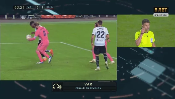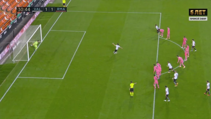 Реал разгневался и прижал хозяев, а моменты не заставили долго ждать: на 57-й минуте Вальверде мощно стрелял с левого края штрафной, а на 58-й Асенсио с паса Модрича вылетал один на один с голкипером – в обоих случаях спас Доменек. Между этими эпизодами Винисиус пробивал с острого угла мимо дальней девятки. Казалось, вот-вот оборона левантийцев треснет, но на 60-й минуте Муса ворвался в штрафную, а лавка Валенсии начала активно апеллировать к арбитру. Оказалось, что Рамос подыграл себе рукой.