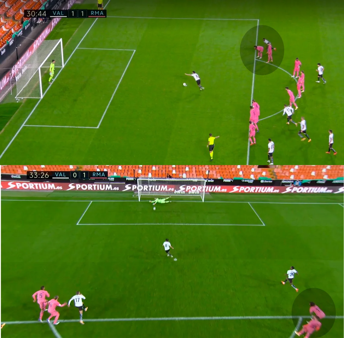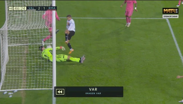В последующие 13 минут на поле ничего не происходило. В первую очередь, удивлял Реал, игра которого окончательно разладилась – впереди у гостей всё валилось из ног. Валенсия грамотно срывала все попытки атак, а на 43-й минуте провела контрвыпад с прострелом с правого фланга – Варан срезал его в собственные ворота, причем мяч полетел по дуге! Куртуа и Рафаэль с горем пополам вынесли сферу с линии, но повторы показали, что гол был. 2:1!