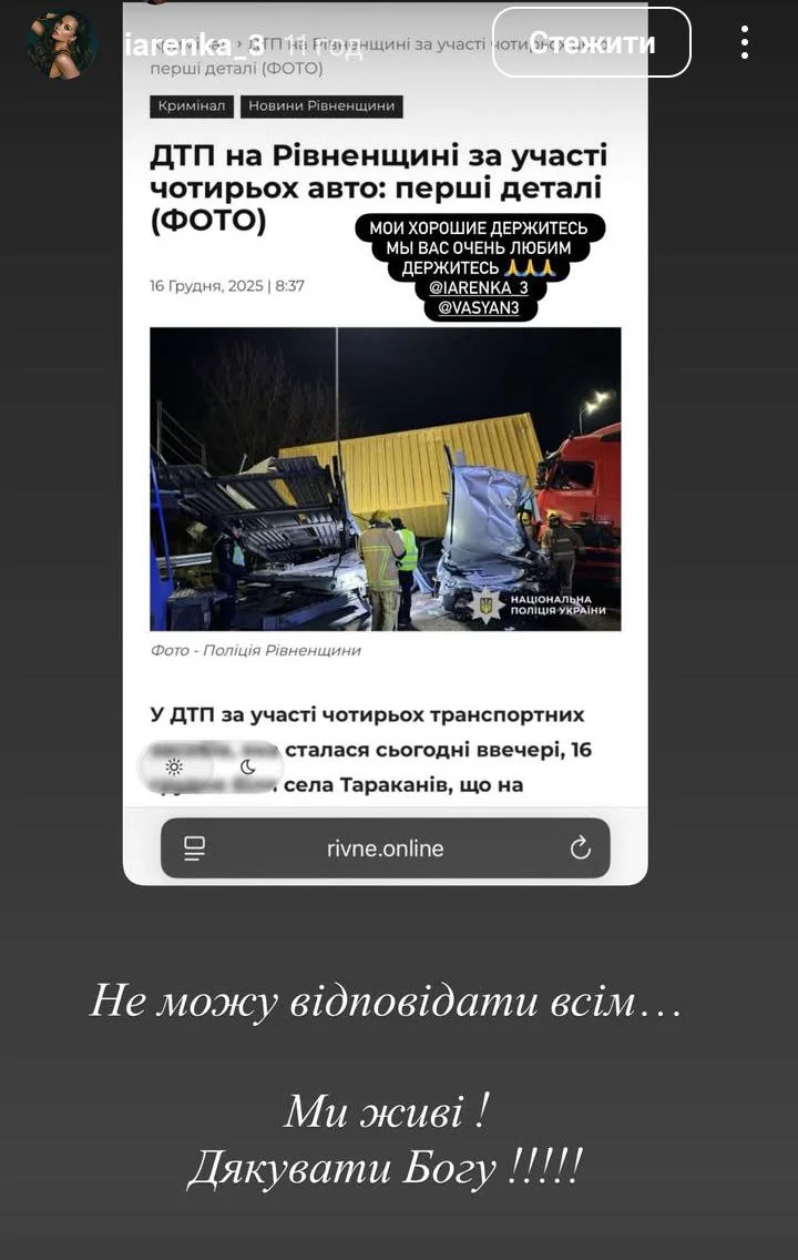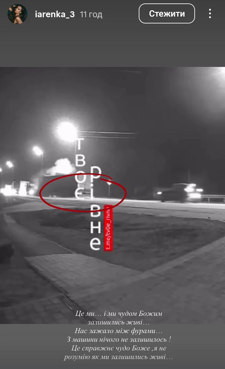 "Это мы... И мы чудом Божьим остались живы... Нас зажало между фурами... От машины ничего не осталось! Это настоящее чудо божье, я не понимаю, как мы остались живы", – написала она.