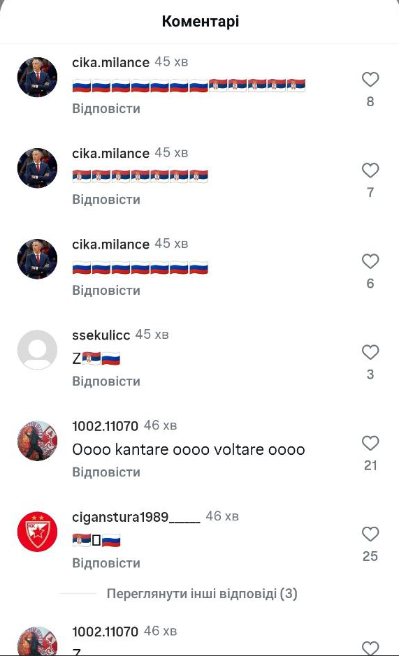 Сербские болельщики заполонили официальный аккаунт Динамо в Инстаграм со словами поддержки страны-агрессора. Сразу после жеребьевки в комментариях появились десятки сообщений в поддержку России.
