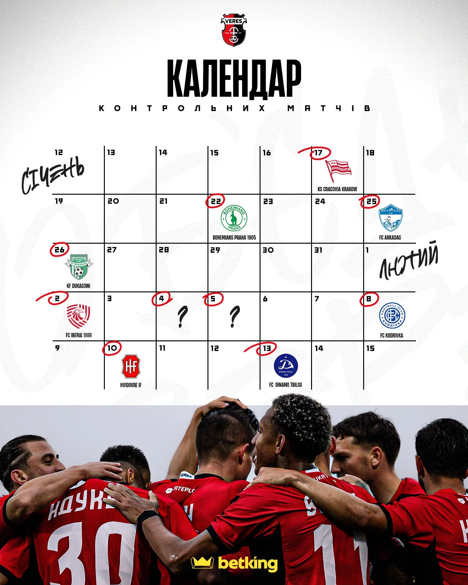 Среди оппонентов "красно-черных" – представители разных чемпионатов Европы и Азии. Верес встретится с шестой командой польской Экстраклясы Краковией, пражским Богемиансом, выступающим во втором дивизионе Чехии, чемпионом Туркменистана Аркадагом и третьей командой Суперлиги Косова Дукаджини. Также в планах матчи против грузинского чемпиона Иберии 1999, самого титулованного клуба страны Динамо Тбилиси, датского Видовре, который сейчас идет четвертым в своем дивизионе, и украинской Кудривки.