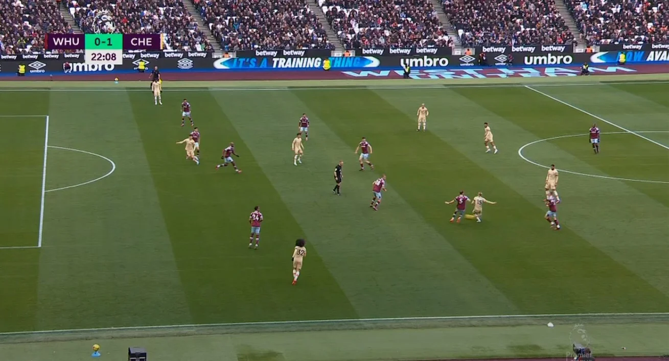 Второе взятие ворот отменяют из-за офсайда. На этот раз Мудрик классно разрезал линии, но Хаверц на чуток опередил события. Вест Хэм забил со второго своего удара. Сначала Антонио технично пробивал пяткой, Кепа выручил. А затем Мудрик откровено не доиграл с Цоуфалом, Боуэн продлил подачу чешского защитника на дальнюю штангу, где Эмерсон воспользовался невнимательностью Джеймса. Челси пропустил впервые за 4 тура. Шесть подряд ударов Вест Хэма, тогда как у команды Поттера несколько расклеилась атакующая игра.