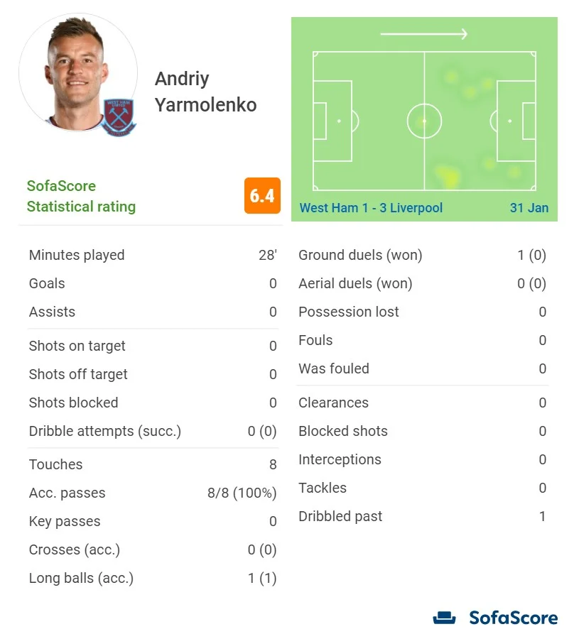 В целом в отведенное время Андрей традиционно проявил много старания, но мало чем помог. Отдал 7 передач (две из них вперед). "Выполнил несколько хороших пасов, показал высокую скорость во время рывка к своим воротам, однако на игру почти не повлиял", – меткую характеристику для Ярмоленко дало профильное издание Football London. Оценки от статистических порталов плохие: SofaScore – 6.4, WhoScored – 5.9.