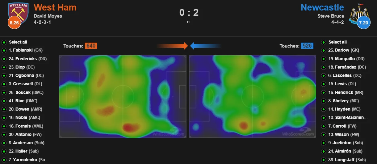 В поединке против Ньюкасла Вест Хэм за 15 ударов создал всего два по-настоящему голевых момента – это были шальные попадания в перекладину в первом тайме. Всё. Больше ничего у "молотобойцев" не получилось. Они не разрезали оборону, не контролировали мяч в последней трети поля, исполнили всего 5 разрезных передач и реже шли в обводку (10 против 15 попыток, 5 против 9 по успешным). Тепловая карта подопечных Дэвида Мойеса просто смешная.