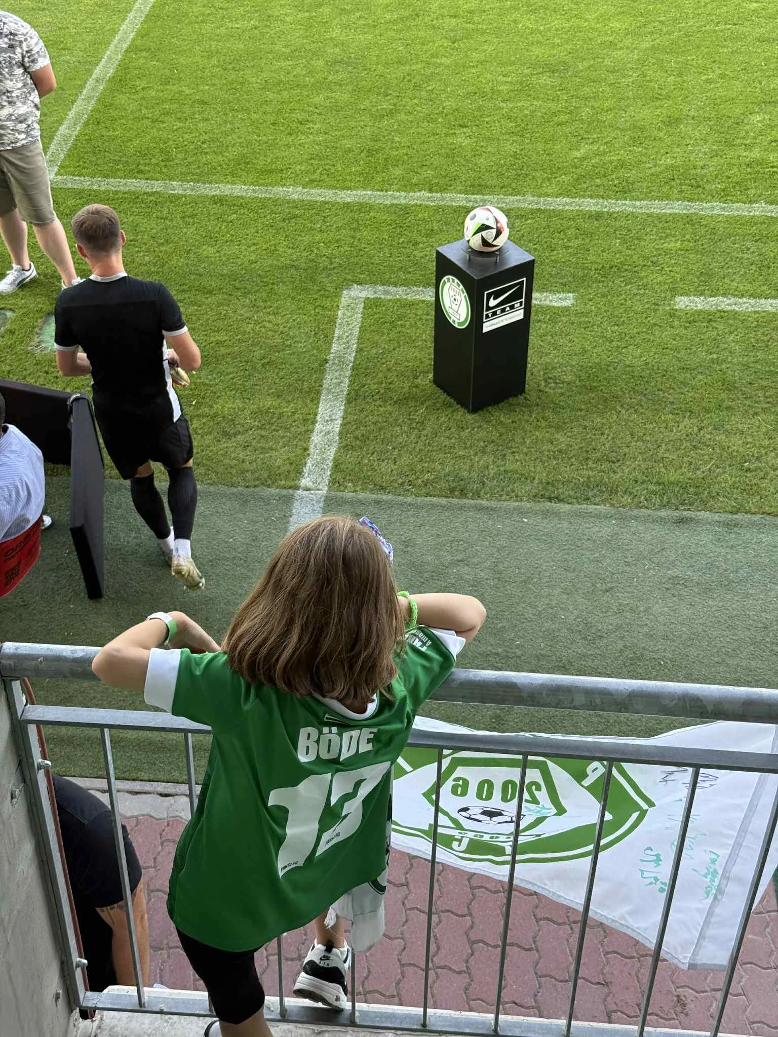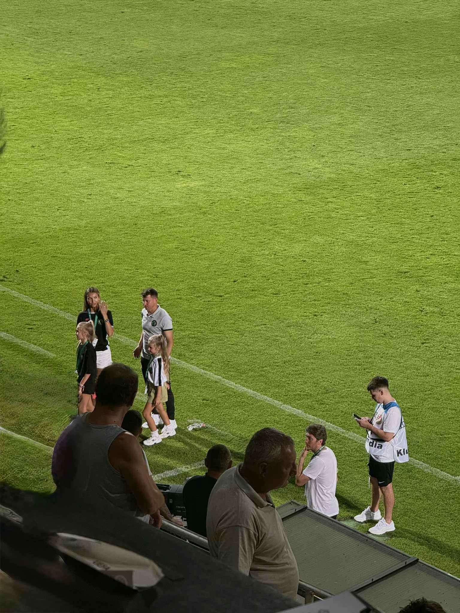 На око я побачила лише два українські прапори – вони вирізнялися на фоні суцільної зелені трибун, як тихий, але впертий сигнал, що гості тут не самі.
