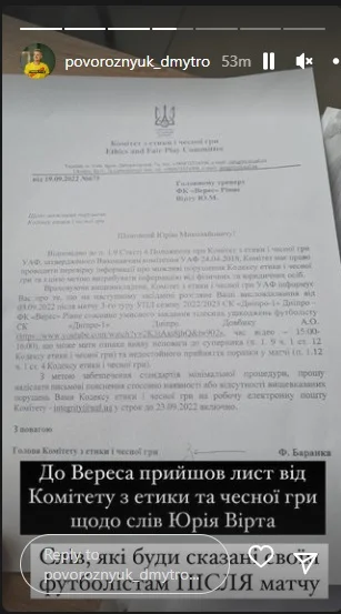 Журналист Дмитрий Поворознюк обнародовал документ, который получил Верес из-за резких слов Юрия Вирта, касающиеся нападающего СК Днепр-1 Артема Довбика.
