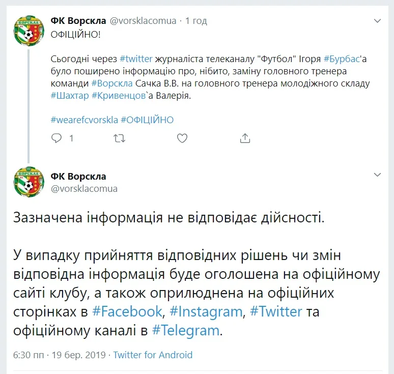 Ворскла прокомментировала информацию журналиста телеканалов Футбол 1/2 Игоря Бурбаса о якобы смене наставника полтавчан Василия Сачко на тренера Шахтера U-21 Валерия Кривенцова.
