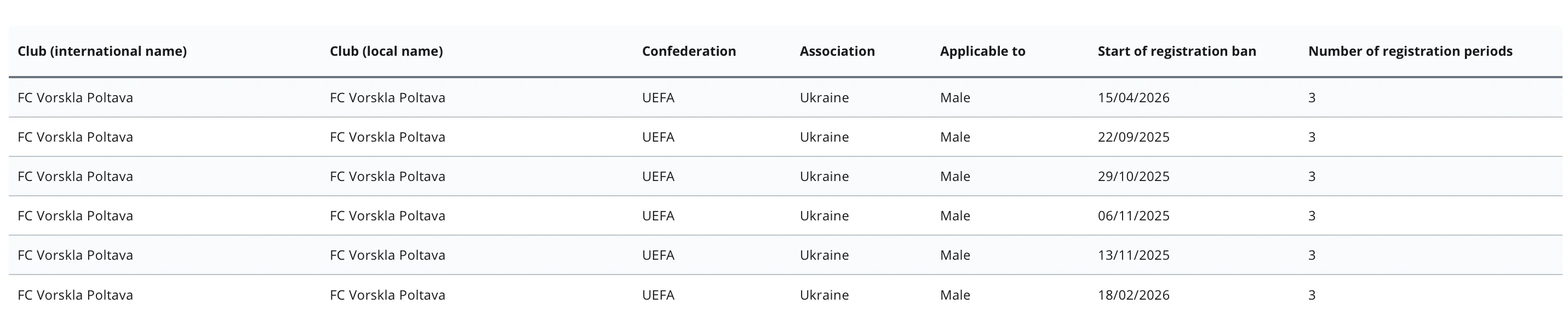 Полтавская Ворскла получила новый запрет на регистрацию игроков. Соответствующая информация обнародована на официальном ресурсе ФИФА.
