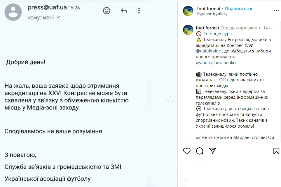 Не за это мы на Майдане стояли! Также не аккредитовали еще несколько СМИ, которые могли задавать неудобные вопросы", – сообщает Instagram-страница программы "Футбольный формат".