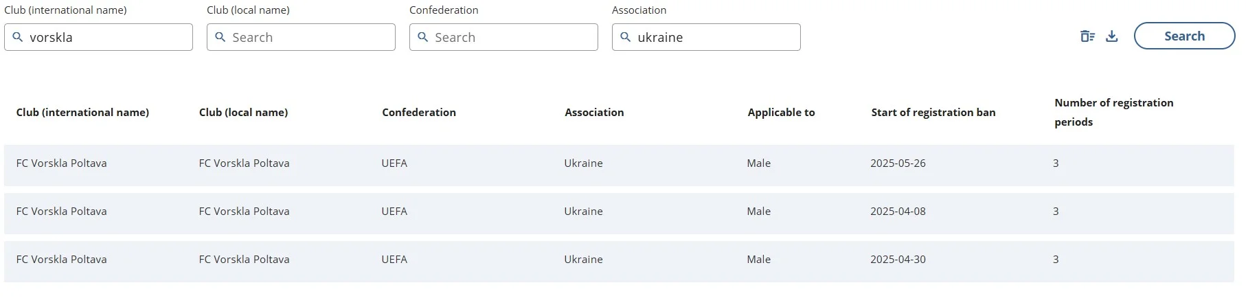 Наказание вступило в силу 26 мая и запрещает подписывать новых игроков в течение трех трансферных окон. Добавим, что первый трансферный бан Ворскла получила 8 апреля 2025 года, а второй – 30 апреля 2025 года.