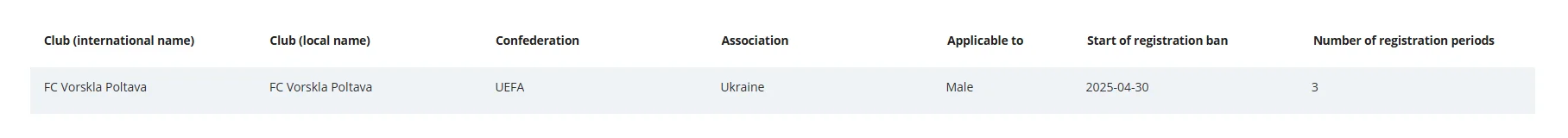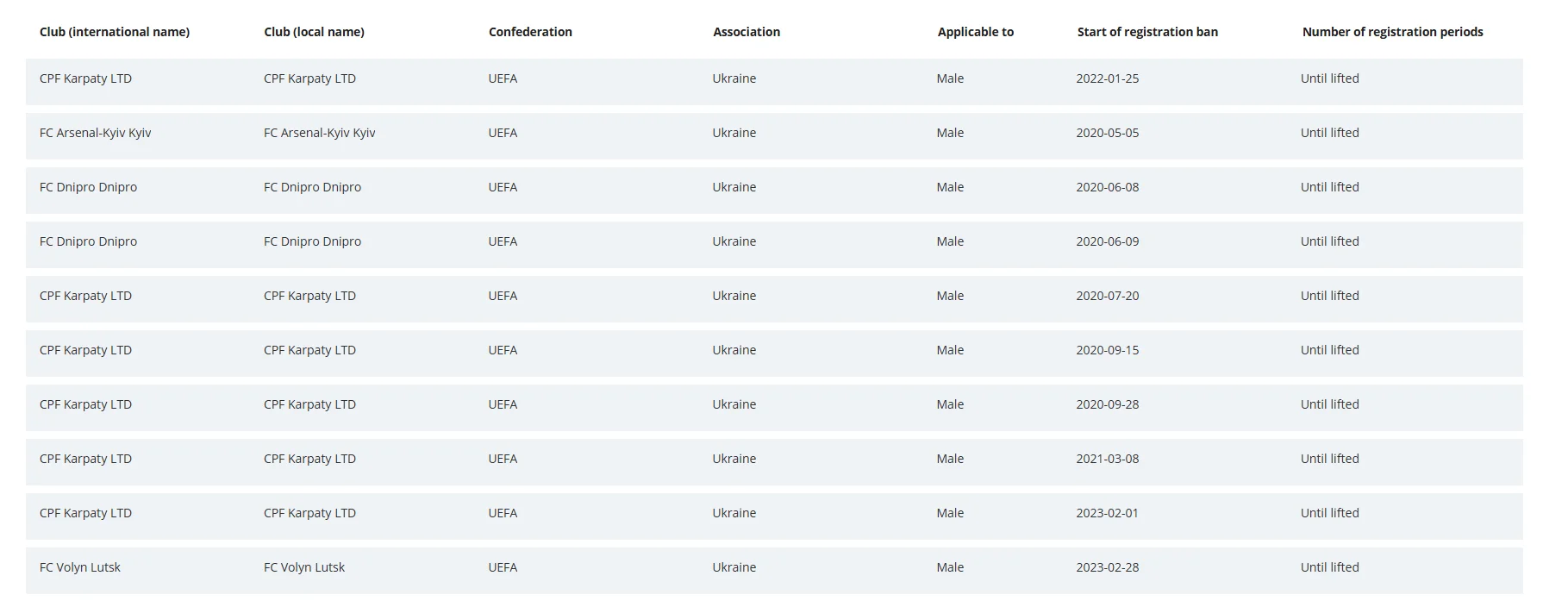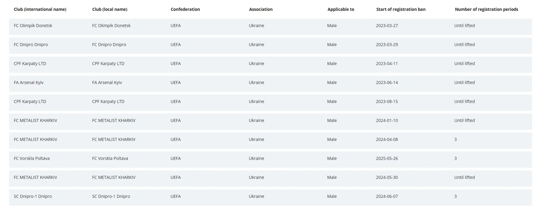 Кроме того, на ряд представителей чемпионата Украины наложено наказание от ФИФА. Некоторые клубы уже прекратили существование, как киевский Арсенал. В общем трансферные ограничения получили такие клубы: Ворскла, харьковский Металлист, СК Днепр-1, Карпаты (КПФ "Карпаты"), киевский Арсенал, Волынь, Олимпик и Днепр. Санкции наложены за невыполненные финансовые обязательства, неурегулированные споры или другие нарушения, зафиксированные на международном уровне.