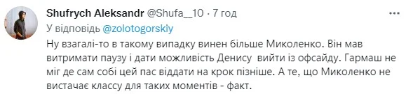 Журналист и комментатор FootballHub Александр Золотогорский считает, что в моменте с офсайдом Гармаш мог бы сыграть аккуратнее. Бывший вице-президент Говерлы Александр Шуфрич не соглашается: "Больше виноват Миколенко".