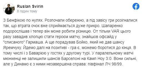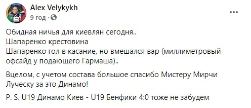 Проклятый VAR "грабит" команду Луческу на последних секундах игры. Все справедливо, но горький привкус после отмененного гола Шапаренко все же остается. Динамо заколихало соперника осторожным футболом, а затем смертельно ужалило – вмешались технологии... Неудивительно, что в соцсетях "бело-синих" больше хвалят, чем критикуют. Домашняя ничья с мощной Бенфикой – далеко не худший результат. Вся борьба еще впереди, тем более ужасная Барса дает надежду на очки.
