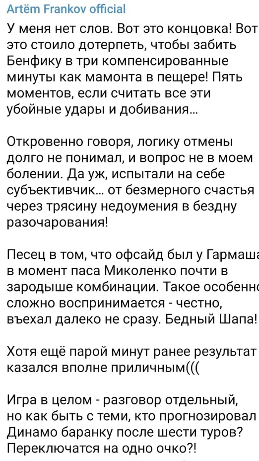 Главреду журнала Футбол Артему Франкову просто не хватает слов после отмененного мяча Динамо.