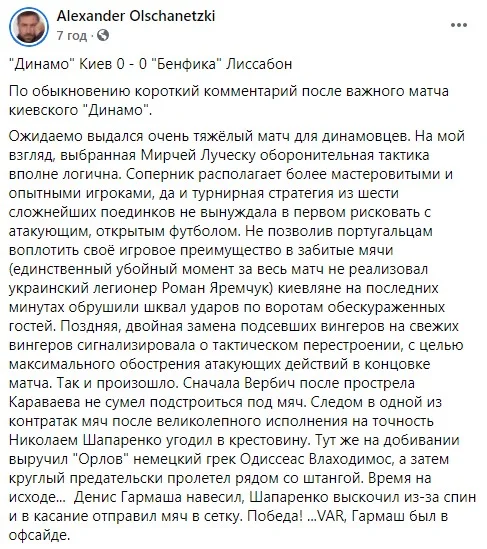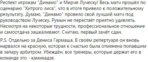 Менеджер Александр Ольшанецкий воспевает "лучший матч Динамо под руководством Луческу".