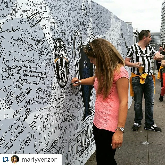 15.13. "Здесь был Антонио", "здесь была Бьянка" и т. д. Фанаты "Юве" оставляют в Берлине свои автографы.