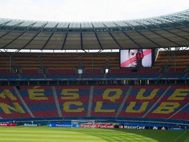 16.00. В секторе "Барсы" на "Олимпиаштадион" показали Роналду