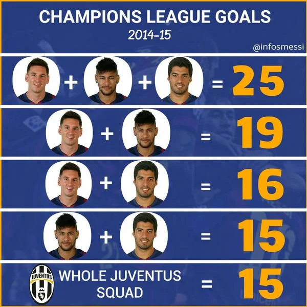 17.51. Mamma mia, что за смертоносная троица: одно лишь MSN забило в текущем розыгрыше Лиги чемпионов больше, чем весь "Ювентус" (автогол игрока "Олимпиакоса" Хименеса на групповом этапе туринцам не в счет). Более того, даже любая пара основных нападающих "Барсы" забивает как минимум не меньше, чем тот же весь состав чемпионов Италии!