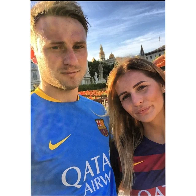 21:11. А Рома Безус с возлюбленной приготовились болеть за "сине-гранатовых" в центре Барселоны.