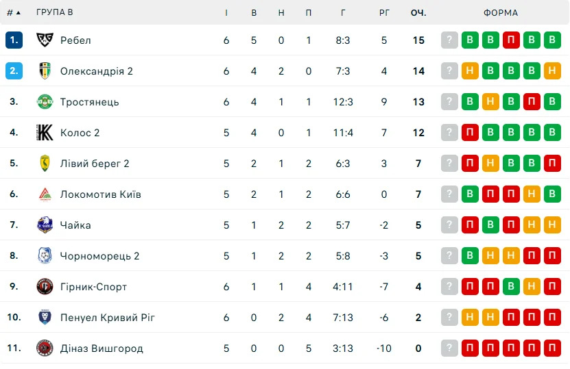 В группе В сегодня также сыграно пять матчей. Черноморец-2 одолел Диназ, Тростянец победил дубль Колоса, а Локомотив одолел Горняк-Спорт. Пенуэл и Александрия-2 сильнейшего не выявили. Ребел благодаря голу Дебелка одолел "Левый Берег-2.
