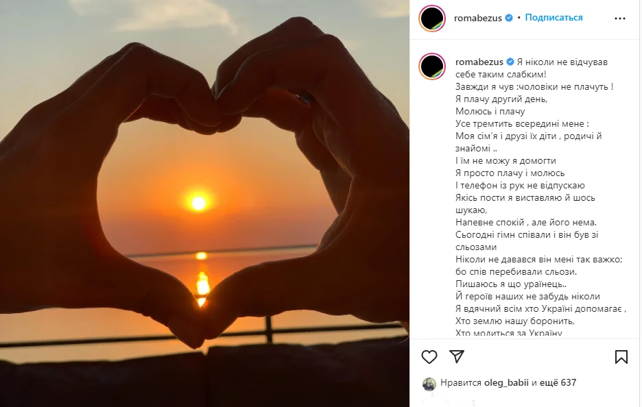 Горжусь я, что украинец и героев наших никогда не забуду. Я благодарен всем, кто Украине помогает, кто нашу землю защищает, кто молится за Украину, кто не безразличен просто. И желаю, чтобы были спокойные ночи. А я буду молиться, верить, плакать", – написал Безус на своей странице в социальной сети Instagram.