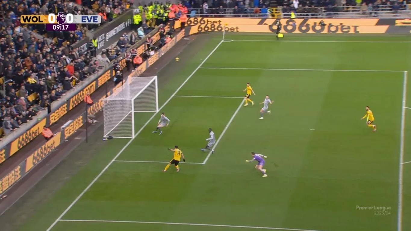 Сегодня "волки" на мгновение быстрее "ирисок" едва ли не в каждом эпизоде. Да, было после перерыва несколько удачных отбиваний экс-динамовца в подкате, но снова ничего не мог противопоставить Жоау Гомешу после того, как хозяева в очередной раз мастерски раскатали команду Дайча в коротком розыгрыше. На 71 минуте проходит какая уже разрезная передача между Брентвейтом и Миколенко. Хван не прошил Пикфорда. Сарабия на фланге Миколенко покатил за спины между двумя центрбеками. Хван на этот раз забил, но забрался в положение вне игры.