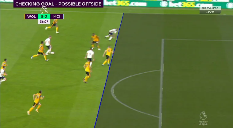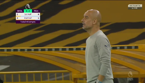 В конце тайма Манчестер Сити упустил сразу три возможности довести дело до разгрома. Так, на 39-й минуте Фоден открылся на правом фланге и из пределов штрафной выстрелил мимо дальней девятки. На 43-й де Брюйне под углом вывалился один на один с Патрисиу, но пробил ему в плечо, а на 44-й Родри после скидки от КДБ нанёс удар с правого фланга (или неудачно прострелил) – сфера просвистела рядом со штангой. Вулверхэмптон же за всё это время имел лишь замыкание Хименеса головой метров с одиннадцати, но мяч пролетел значительно выше ворот.