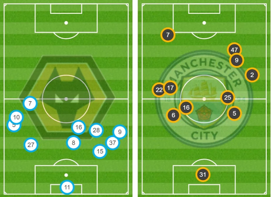 Усреднённые позиции Вулверхэмптона и Манчестер Сити в 10-й минуты