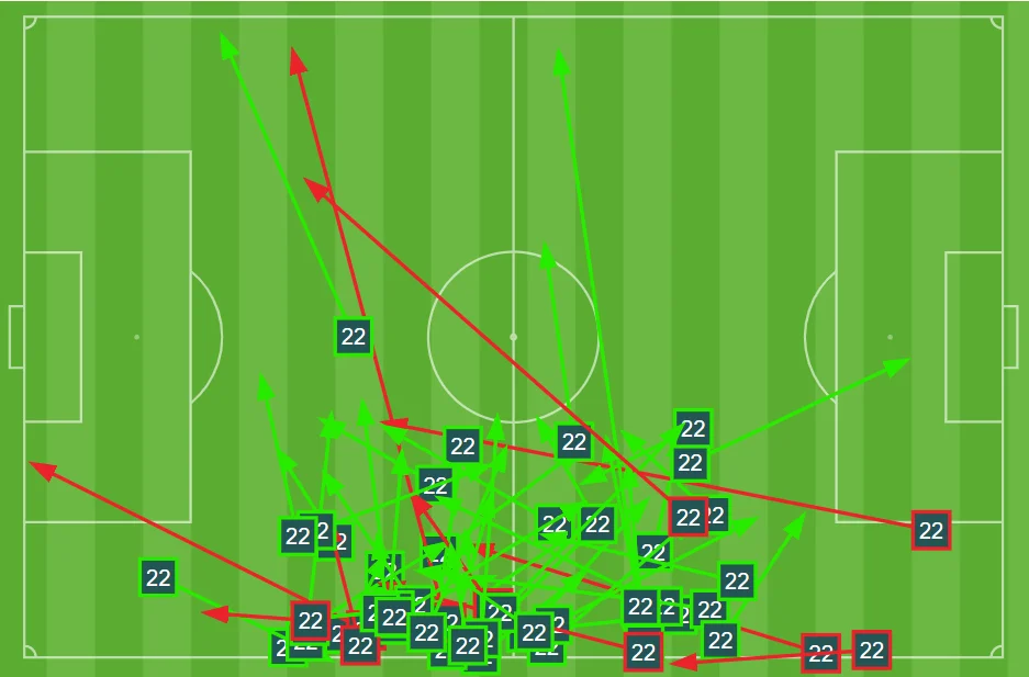 Впервые взглянув на статистику передач бельгийца, можно ужаснуться – всего 79% точности (самый низкий показатель в команде) при не самом большом количестве (78). Впрочем, на то КДБ и гений, чтоб даже при таком браке выдать фантастический поединок.