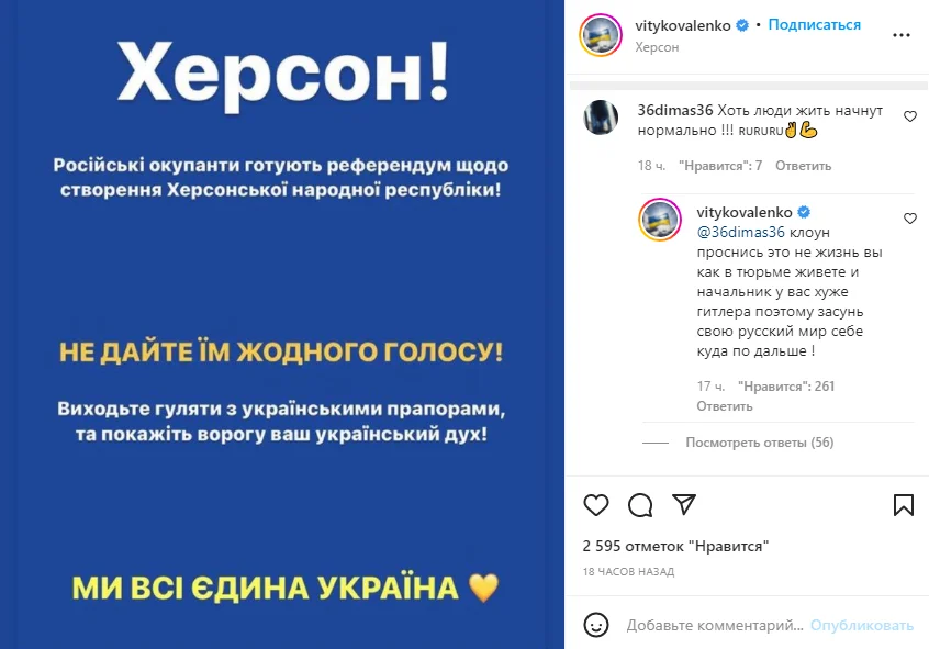 Поэтому засунь свой "русский мир" себе куда-нибудь подальше!" – написал Коваленко в комментариях к своему посту в Instagram, в котором призвал жителей Херсона не отдать ни одного голоса на так называемом референдуме за создание хнр.