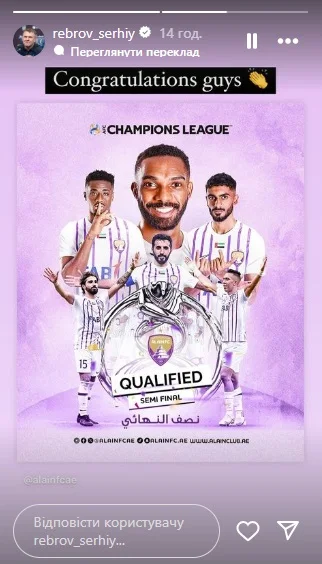 Главный тренер сборной Украины Сергей Ребров не остался в стороне от большого триумфа Аль-Айна в Лиге чемпионов Азии.