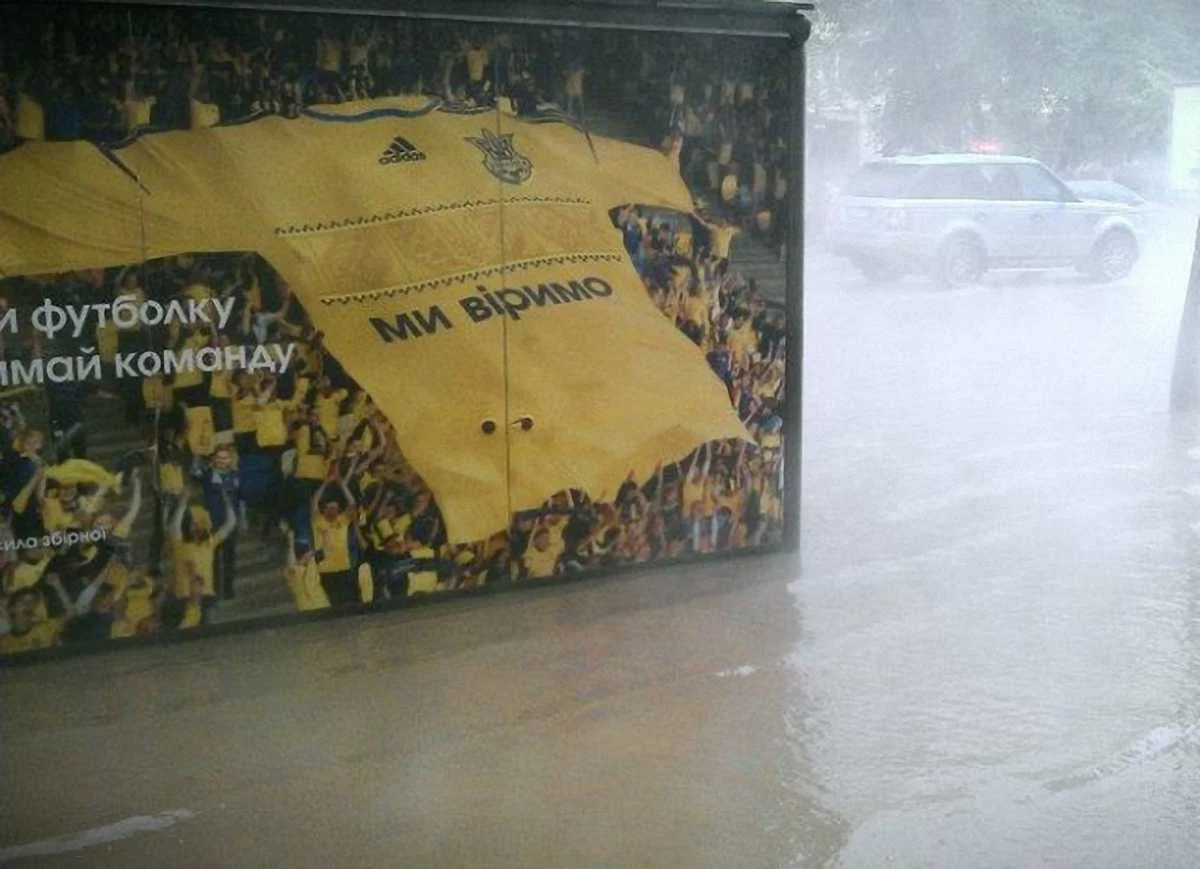 Из-под асфальта, который лопнул, прорвалась горячая вода. Интересно, что именно здесь проводился капитальный ремонт дорог и реставрация зданий к началу Евро-2012.
