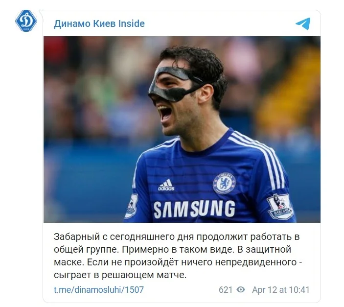 По информации Динамо Киев Inside, уже сегодня Забарный продолжит работать в общей группе со специальной маской. Более того, Илья имеет все шансы сыграть в поединке с Шахтером, который запланирован на субботу, 17 апреля.
