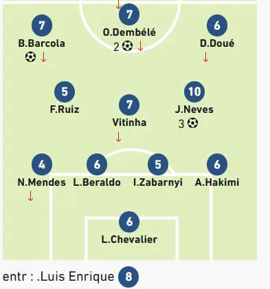 Самый низкий балл у Нуну Мендеша (4), который сыграл только один тайм. Самую высокую оценку получил Жоау Невеш, который оформил хет-трик, забив два мяча в падении через себя. Португальцу поставили 10-ку, которую L'Equipe раздавал лишь 14 раз за всю свою историю.