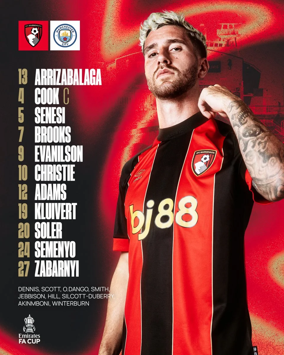 Стартовый состав состав Борнмута: Аррисабалага – Кук, Сенеси, Забарный, Солер – Кристи , Адамс, Брукс – Семеньо, Эванилсон, Клюйверт.