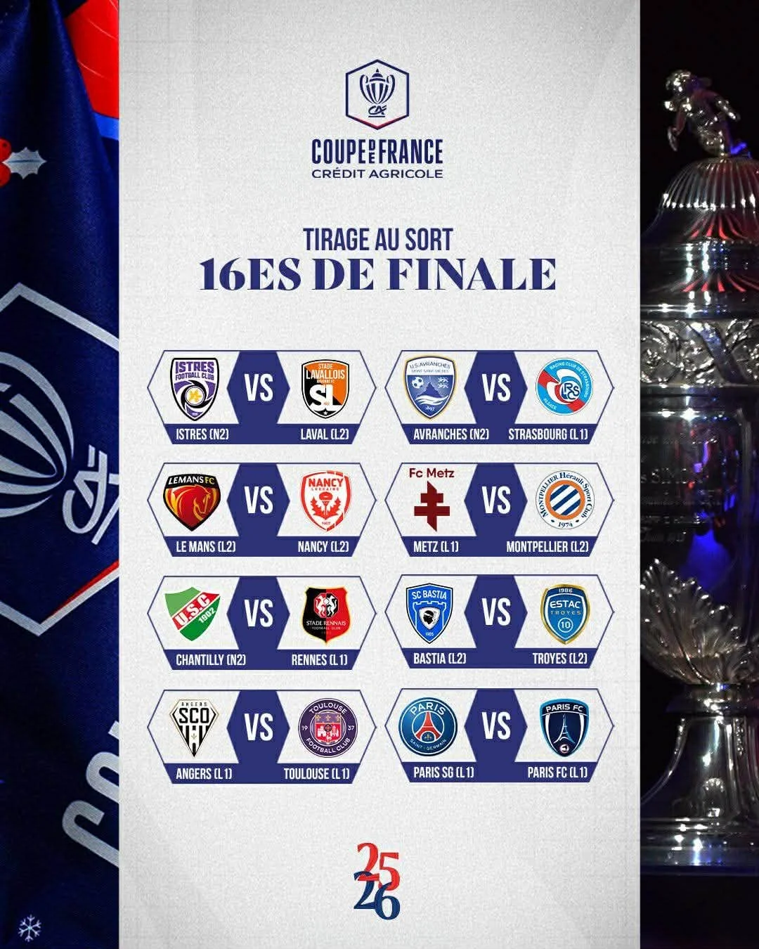 Состоялась жеребьевка 1/16 финала Кубка Франции 2025/26.
