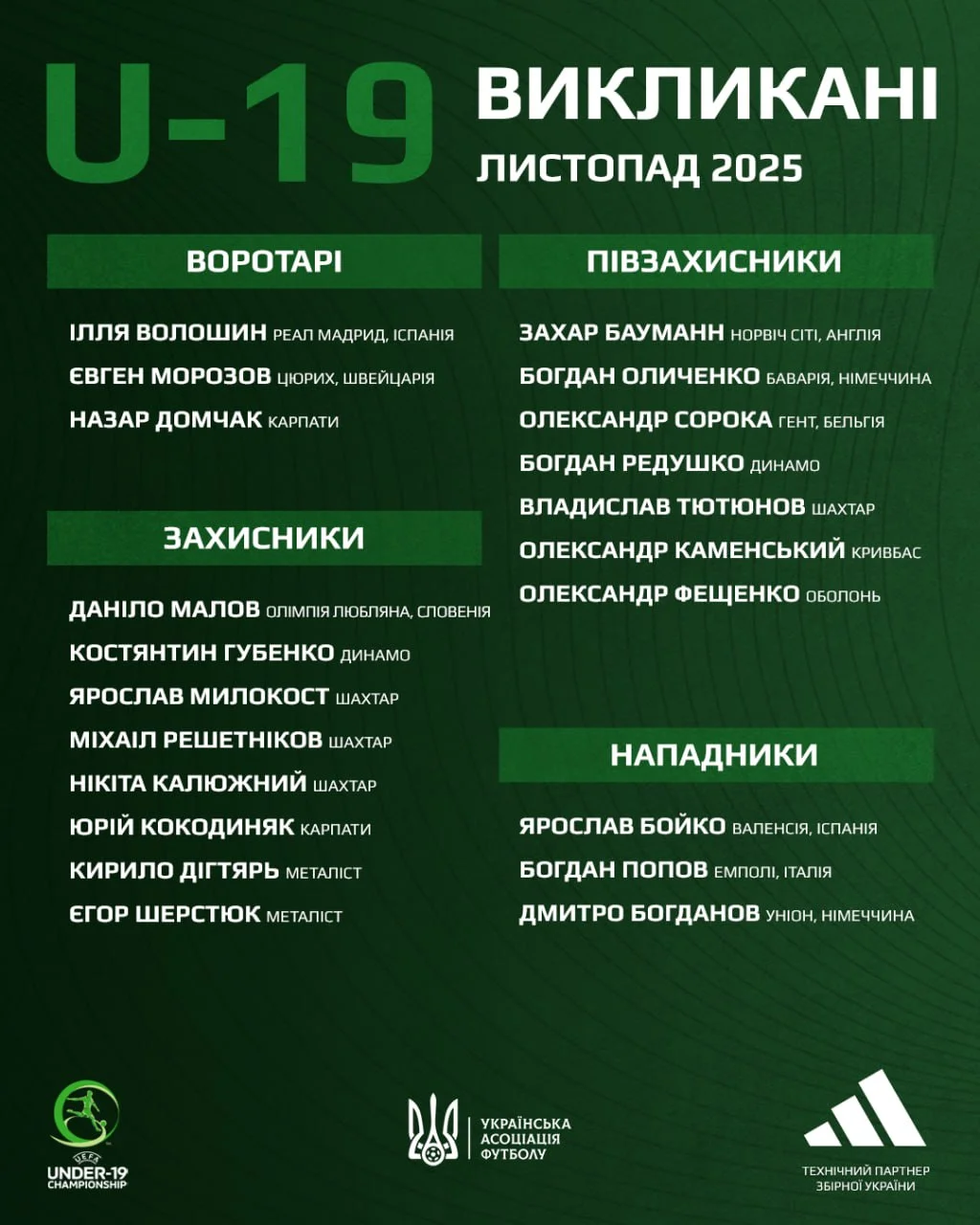 Заявка сборной Украины U-19 на матчи квалификации Евро-2026 – форвард из чемпионата Италии и игроки Реала и Баварии